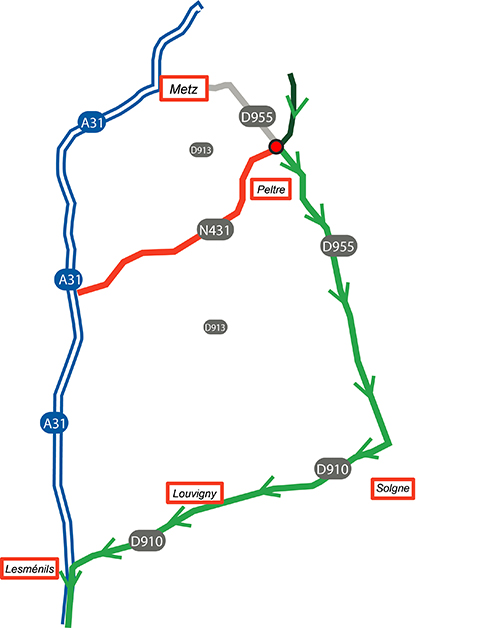 La déviation mise en place invitera les usagers à sortir à l’échangeur de Hauconcourt pour suivre l’A4, l’A315, la RN431 puis les M955/D955 et enfin la D910 pour retrouver l’A31 par l’échangeur n°28 de Lesmenils.