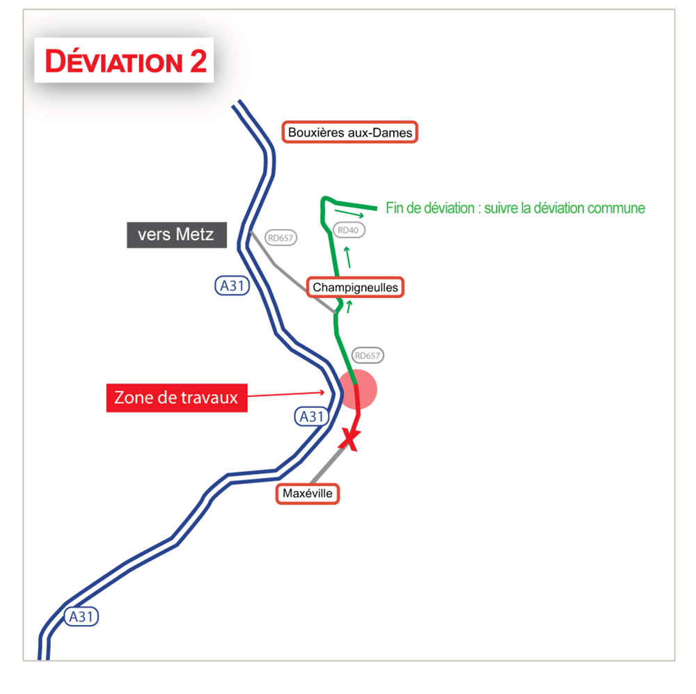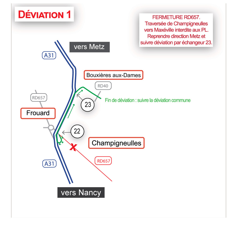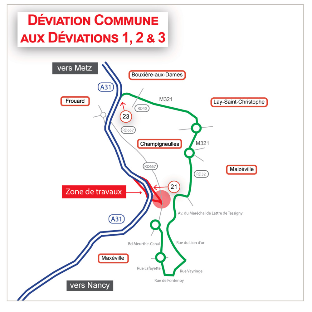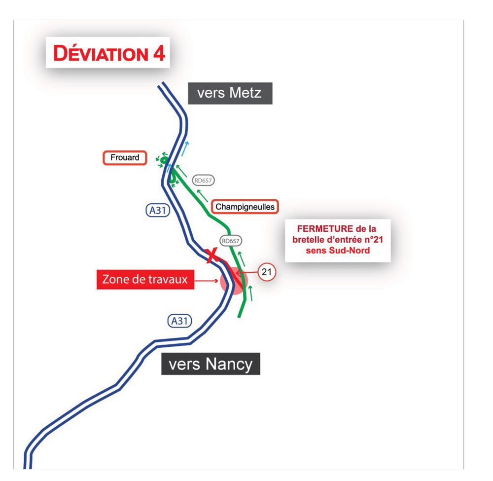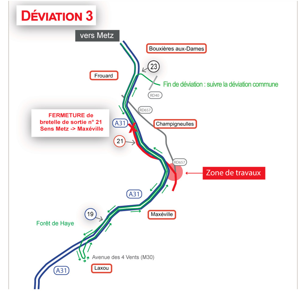 - DÉVIATION 3 : Pour les usagers de l’A31, dans le sens Metz → Nancy, la fermeture de la bretelle de sortie échangeur n°21, dans le sens Nord - Sud s’accompagnera des déviations suivantes :