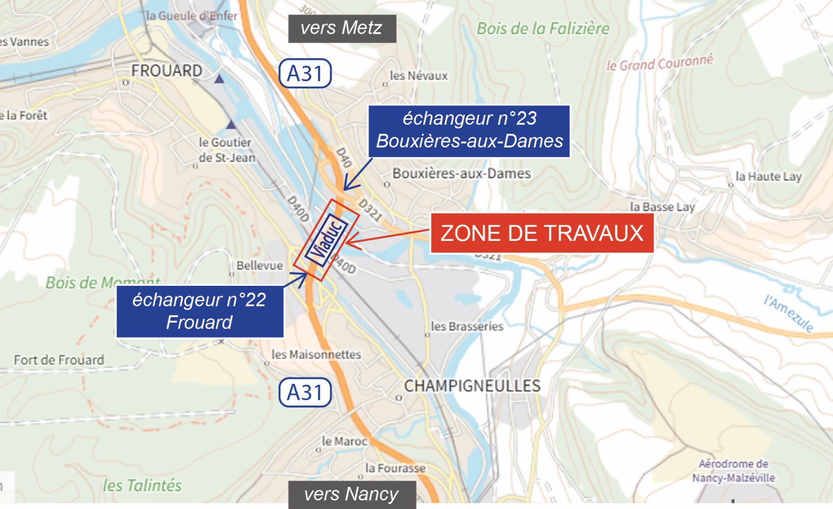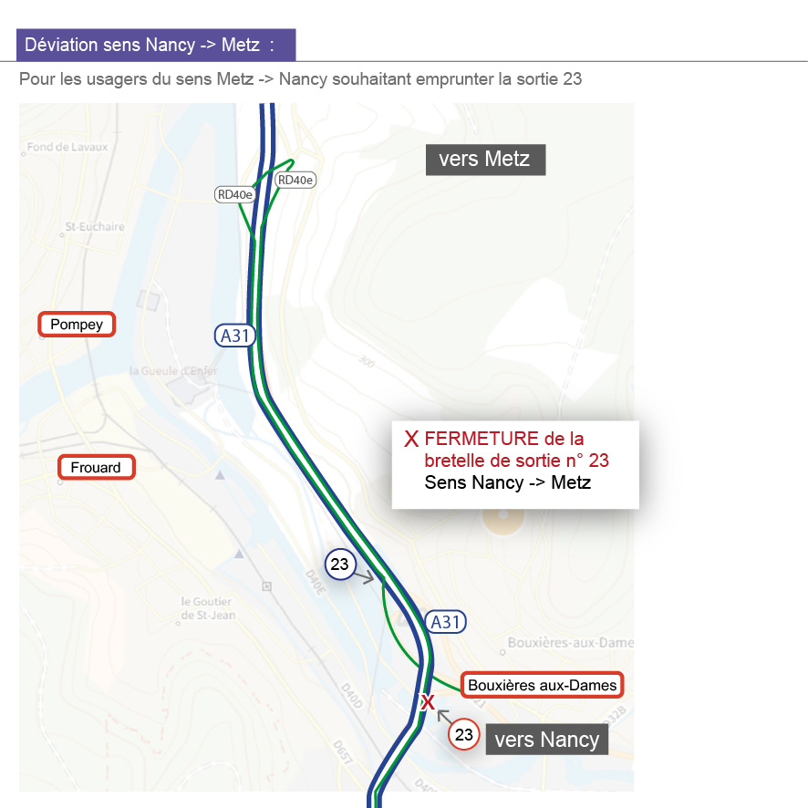 La mise en place du balisage pour la réalisation de ces travaux nécessitera la coupure de l’A31 dans le sens Metz > Nancy avec sortie obligatoire au diffuseur n°23 de Bouxières-aux-Dames (déviation A) et la fermeture de la bretelle d’accès à l’A31 en direction de Nancy du diffuseur n° 23 (déviation B).