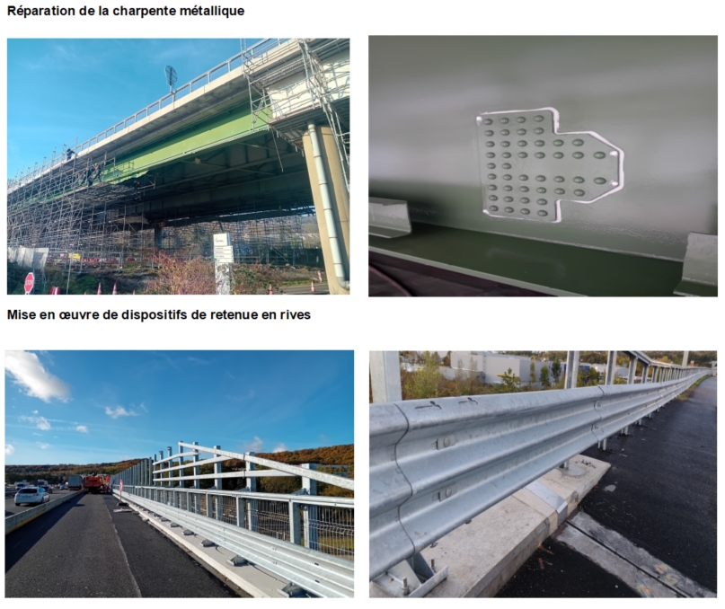 En 2025, les travaux de réparation ont débuté après la réalisation de l’opération de désamiantage de la chaussée. À ce jour, une part significative des interventions a été menée à bien, notamment sur la structure métallique du viaduc situé sous l’autoroute, avec le renforcement par la mise en place de tôles additionnelles, mais également le traitement des fissures les plus critiques.