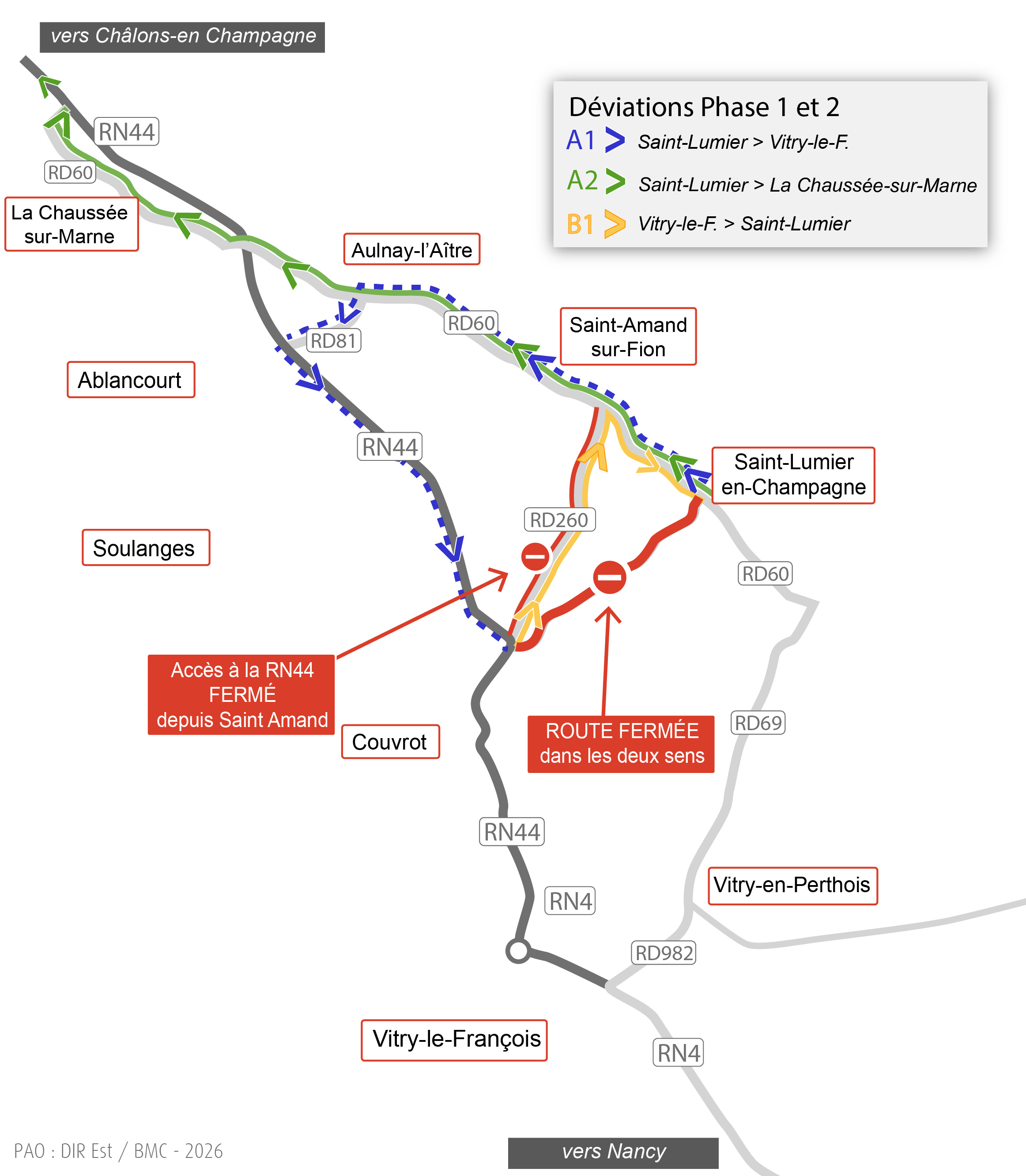 Les usagers en provenance de Saint-Lumier-en-Champagne et de Saint-Amand-sur-Fion emprunteront la RD60 en direction d’Aulnay-l’Aître, puis la RD81 en direction d’Ablancourt, puis la RN44 en direction de Vitry-le-François.