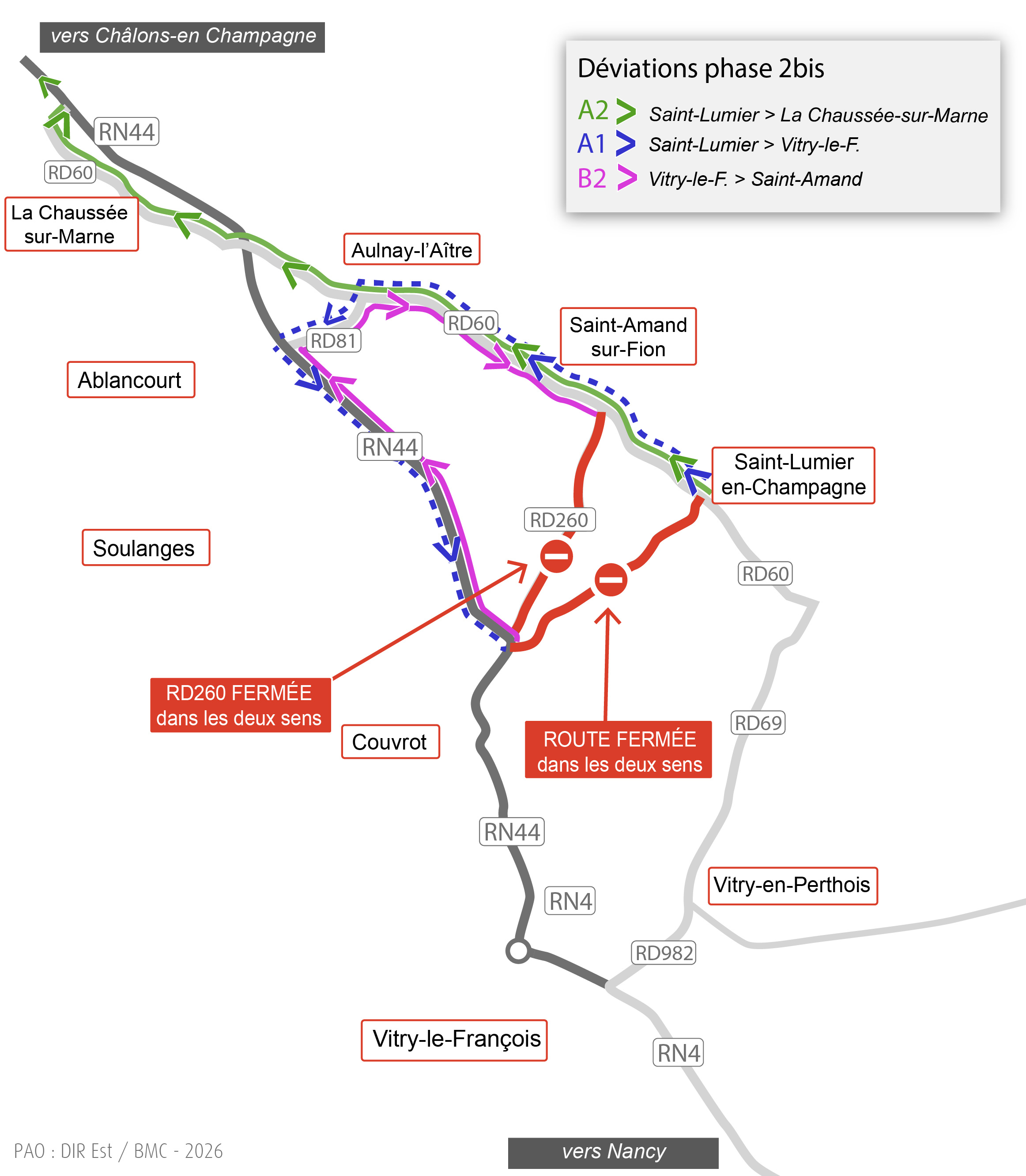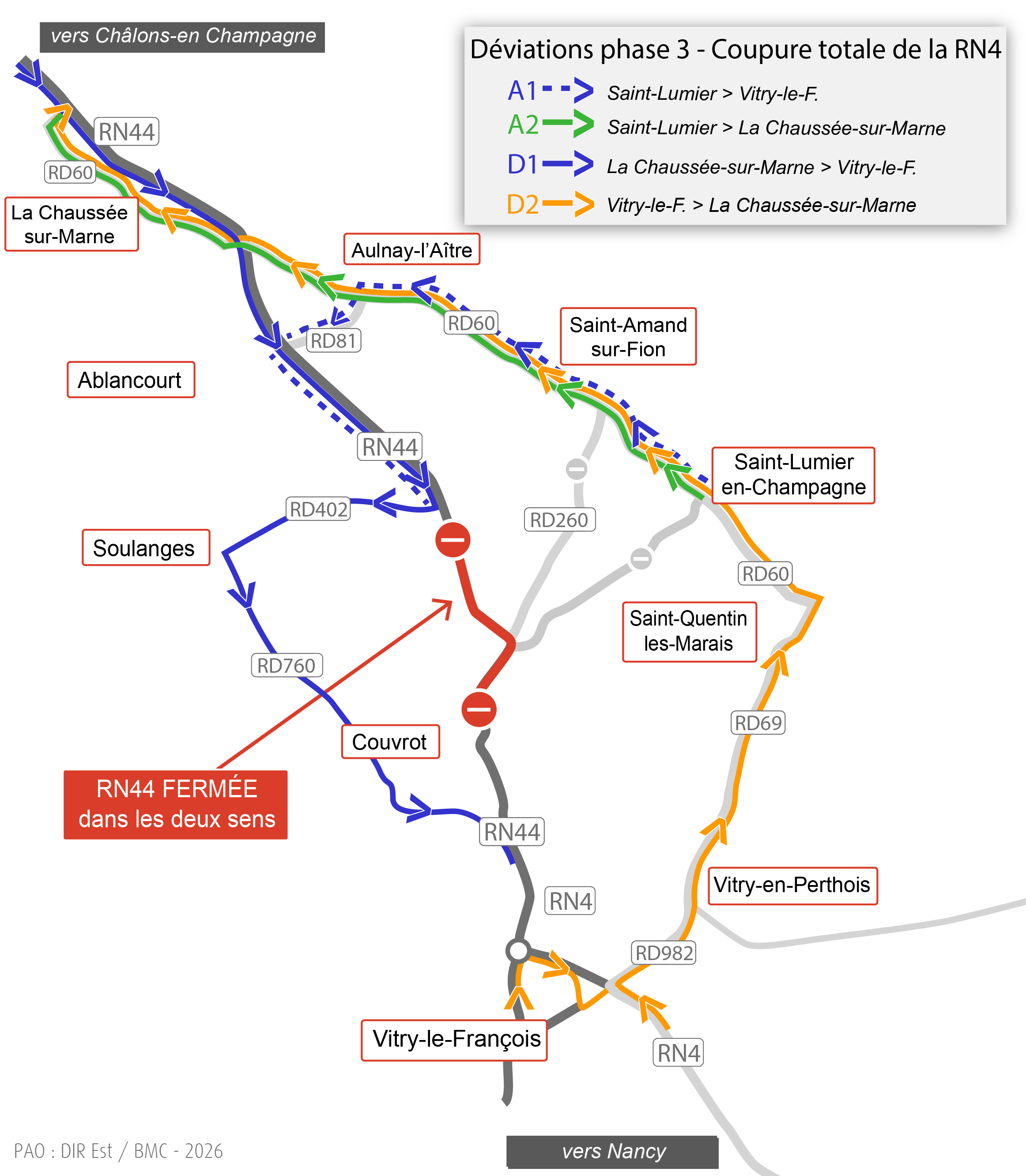 Les usagers en provenance de Vitry-le-François circulant sur la RN44 emprunteront la RD260 en direction de Saint-Amand-sur-Fion, puis emprunteront la RD60 en direction de La-Chaussée-sur-Marne, avant de reprendre la RN44 en direction de Châlons-en-Champagne.