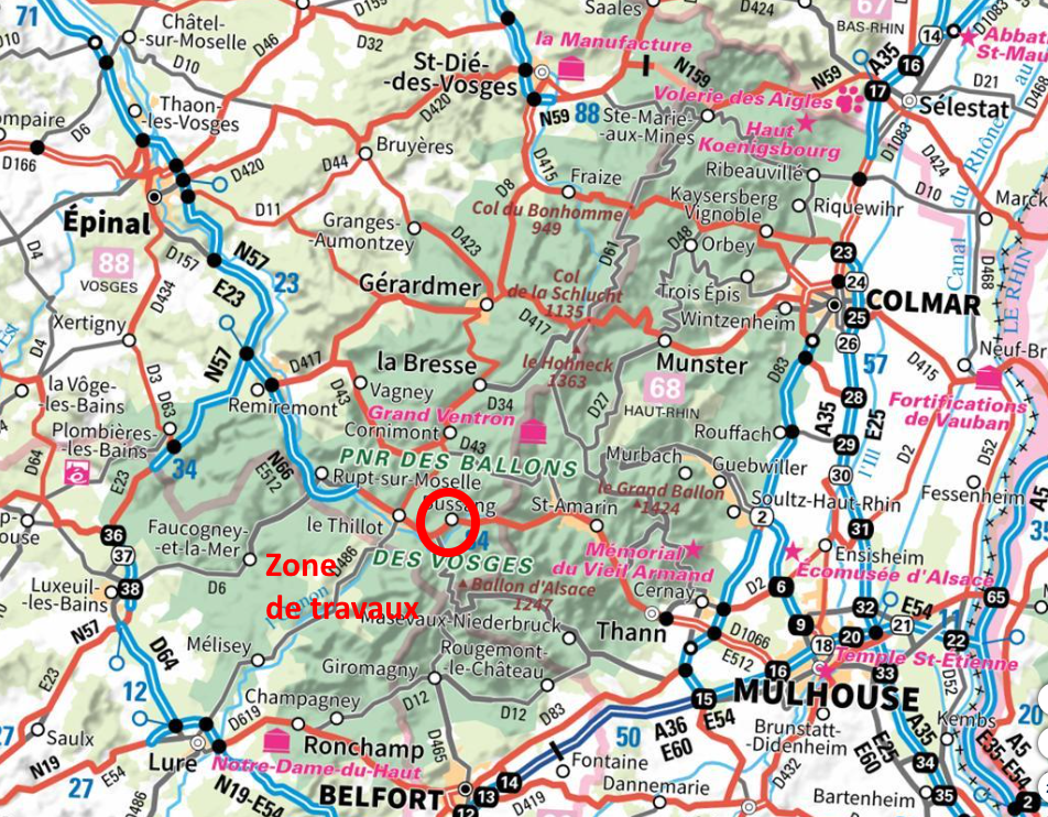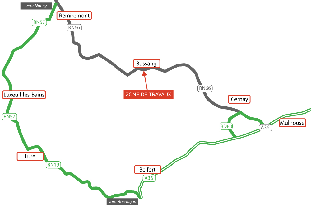 - Déviation obligatoire pour les poids-lourds en transit via le col de Bussang, par le contournement sud du massif Vosgien, entre Remiremont (88) et Cernay (68).