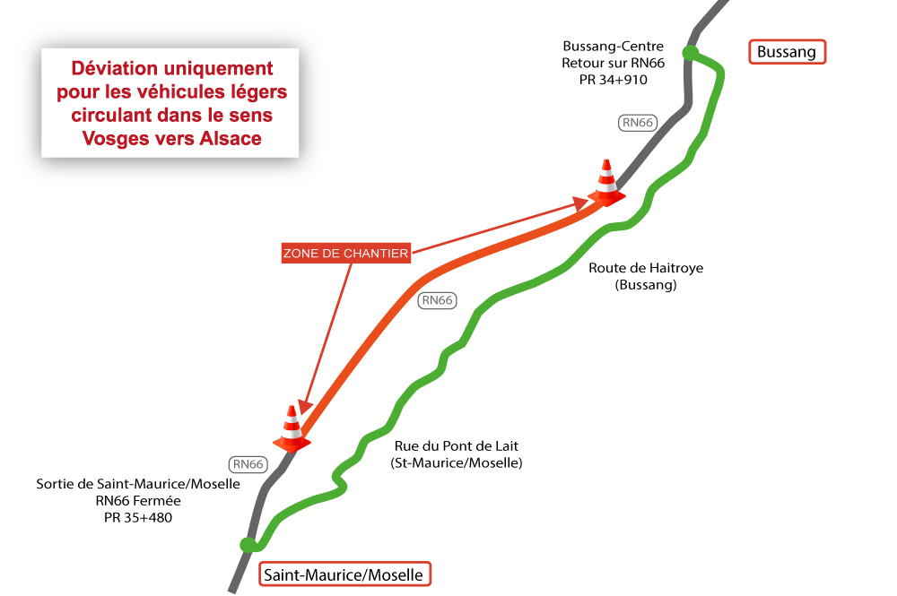 - une coupure de la RN66 nocturne à tous véhicules, de 19h à 6h, du lundi soir au samedi matin, entre Saint-Maurice-sur-Moselle et Bussang, avec des déviations locales pour les seuls véhicules < 3,5t