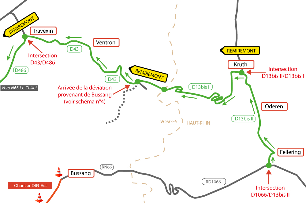 Au niveau du carrefour giratoire D1066 / D13BisII (Fellering), les usagers emprunteront la D13BisII en direction du col d’Oderen, puis D13Bis, puis D13bisI (Kruth), puis D43 (Vosges) vers Ventron, puis D486 (Travexin) pour reprendre la direction du Thillot et retrouver la N66.