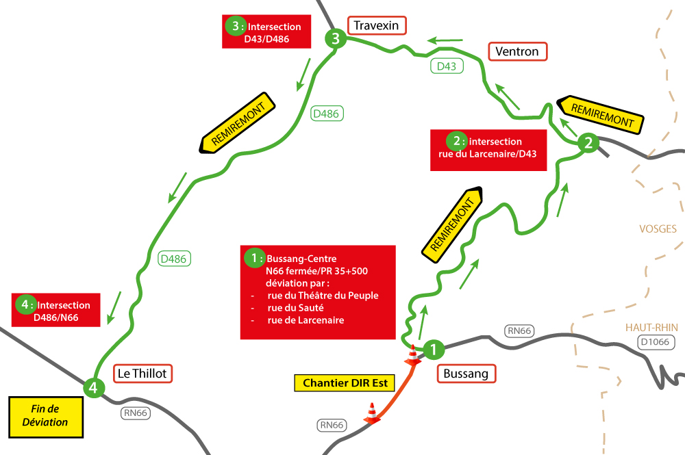 Les usagers quitteront la N66 au niveau de la rue du Théâtre du Peuple pour emprunter la rue de Saute, puis rue du Larcenaire, puis D 43 vers Ventron, puis D486 (Travexin) pour reprendre la direction du Thillot et retrouver la N66.